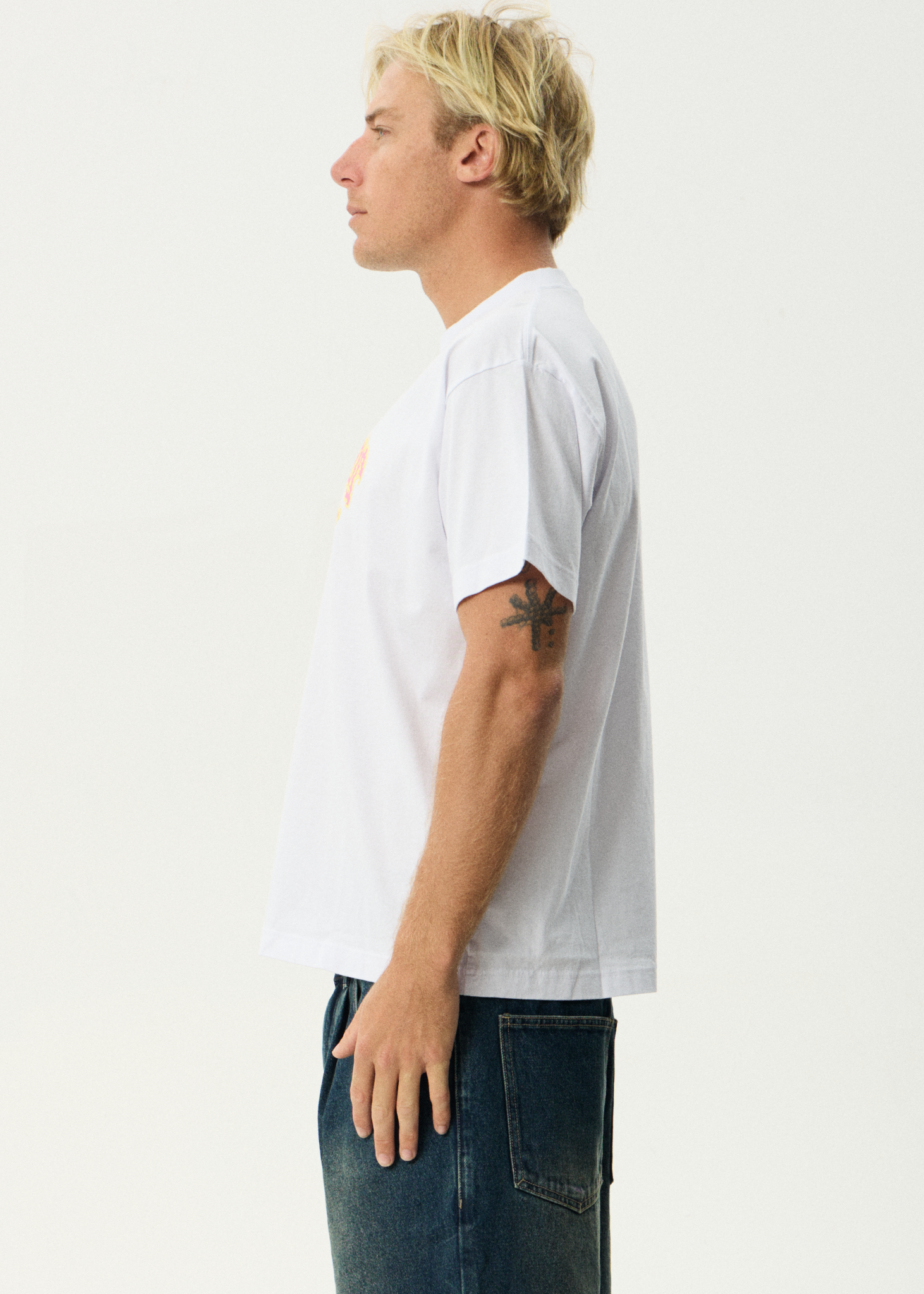 Mens boxy t-shirtSlightly cropped wider fitRibbed crew necklineDry hand feelCrackled screen printed artworkSize up for an oversized fit