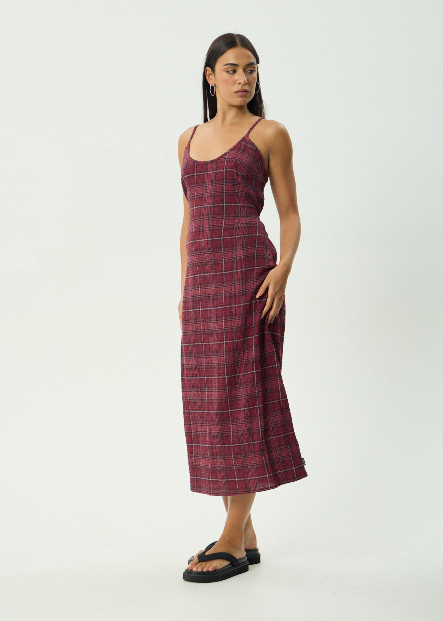 Womens midi dressRelaxed fitScooped necklineAdjustable shoulder strapsBust dartsRemovable waist tieTextured stretch seersuckerCustom yarn dyed woven check