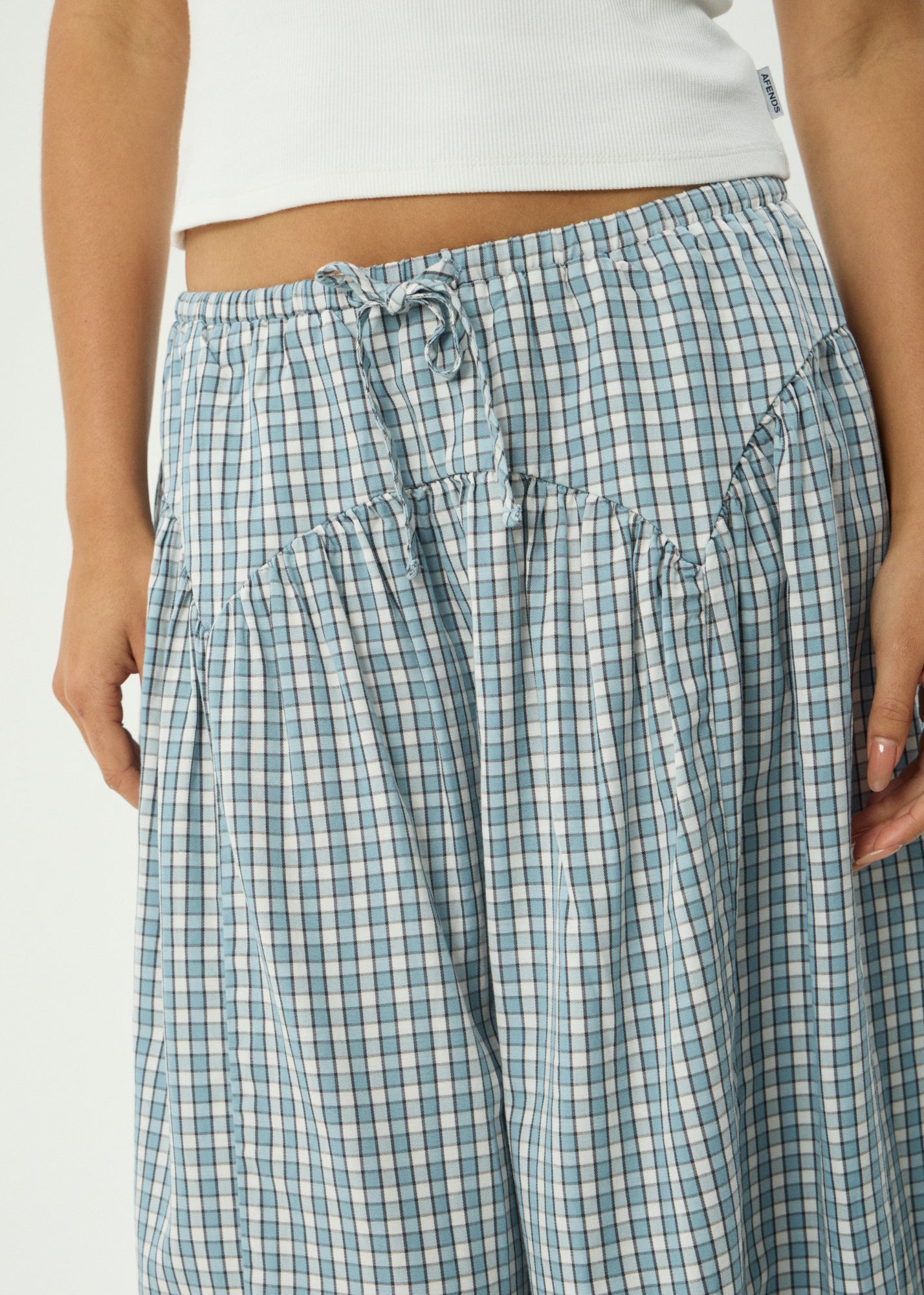 Womens midi skirtMid-high rise waistElasticated waist with drawstringShaped yoke with full gathered skirtCustom yarn dyed woven checkTrue to size
