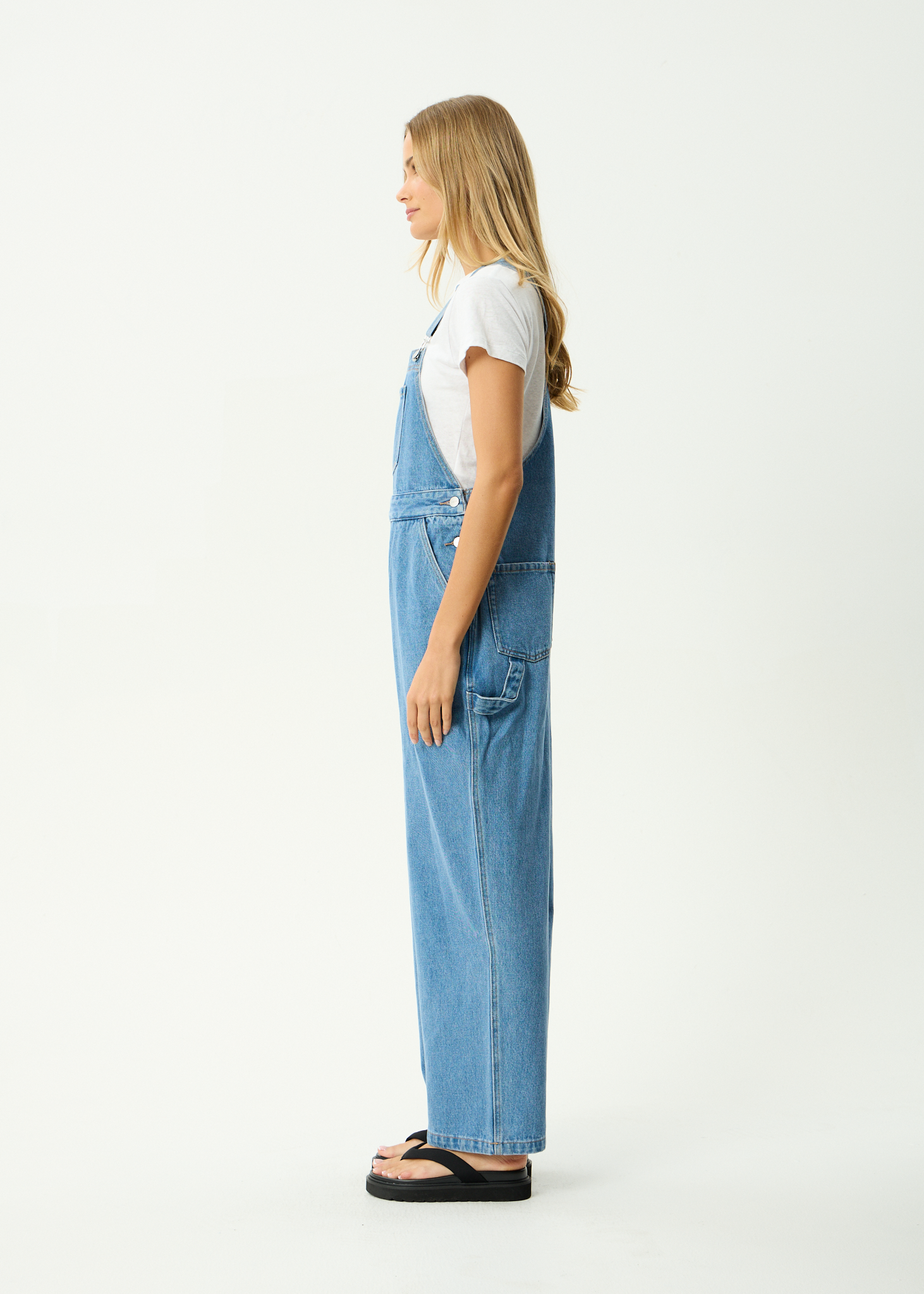 Womens Denim OverallsBaggy FitWide LegFront, Side and Back PocketsButton Clasp Adjustable StrapsButton Up SidesRecycled compressed card back patch
