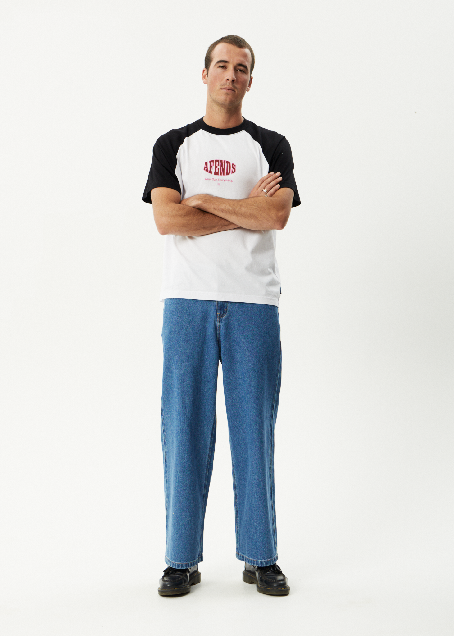 Mens boxy raglan t-shirtSlightly cropped wider fitRibbed crew necklineDry hand feel blended recycled cottonCombination of puff print, embroidery and screen printed artworkContrast sleeves and neck bindSize up for an oversized fit