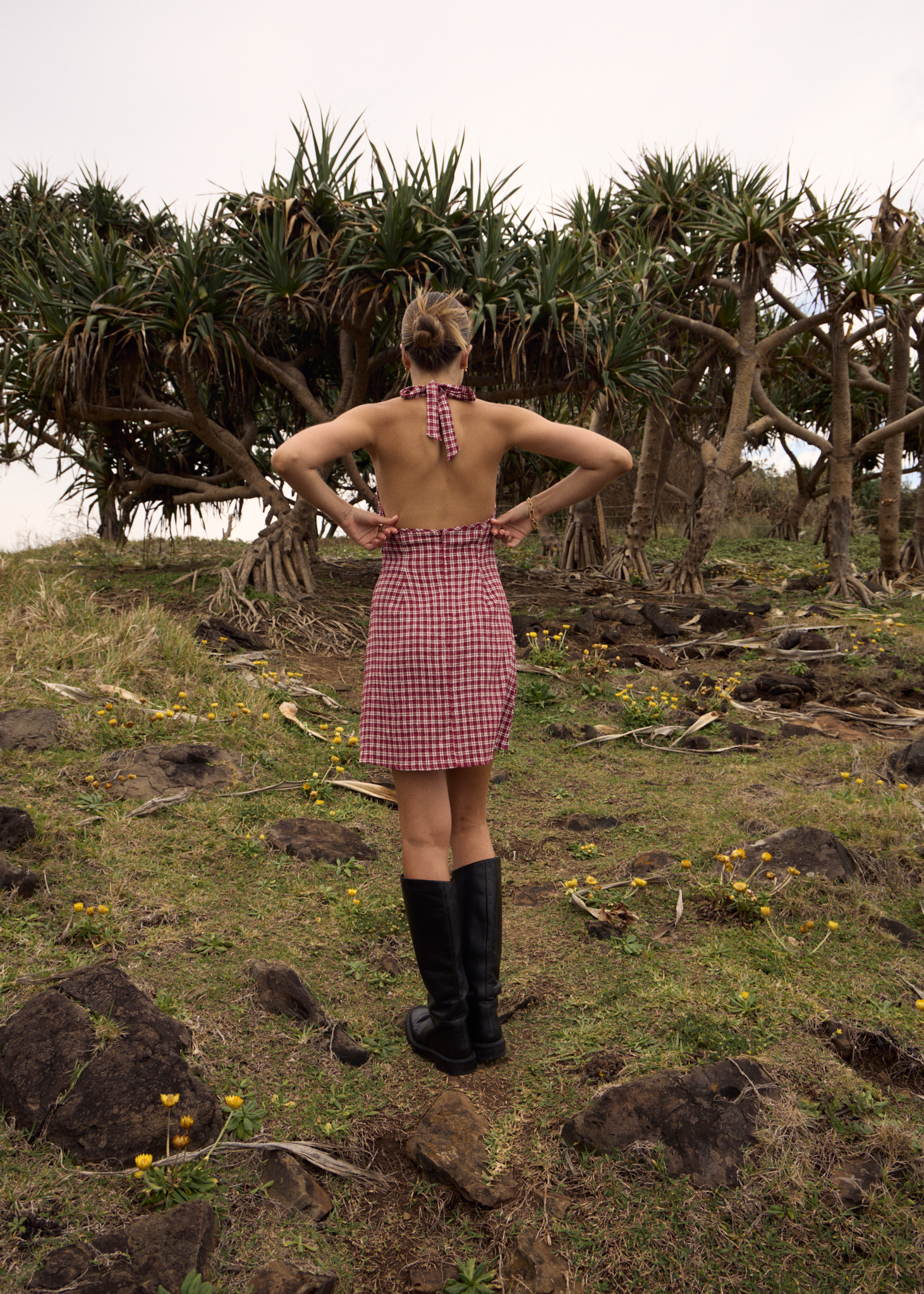 The 'Base' collection in Burgundy Check is thoughtfully crafted from a hemp and tencel seersucker blend, delivering a refined texture with a structured yet breathable feel for everyday wear. This mini dress is designed with a skimming fit, halter neck tie, centre front ruching and invisible back zip for a seamless finish.