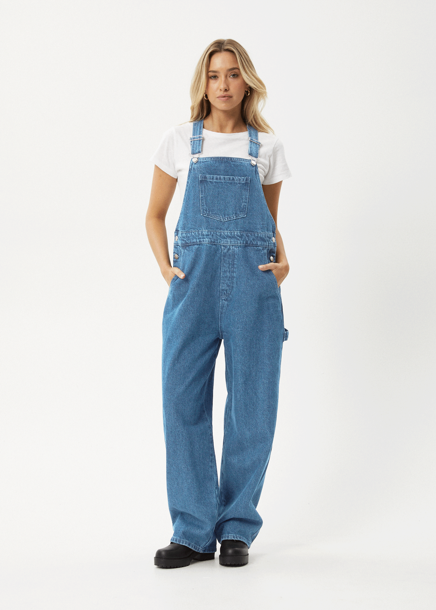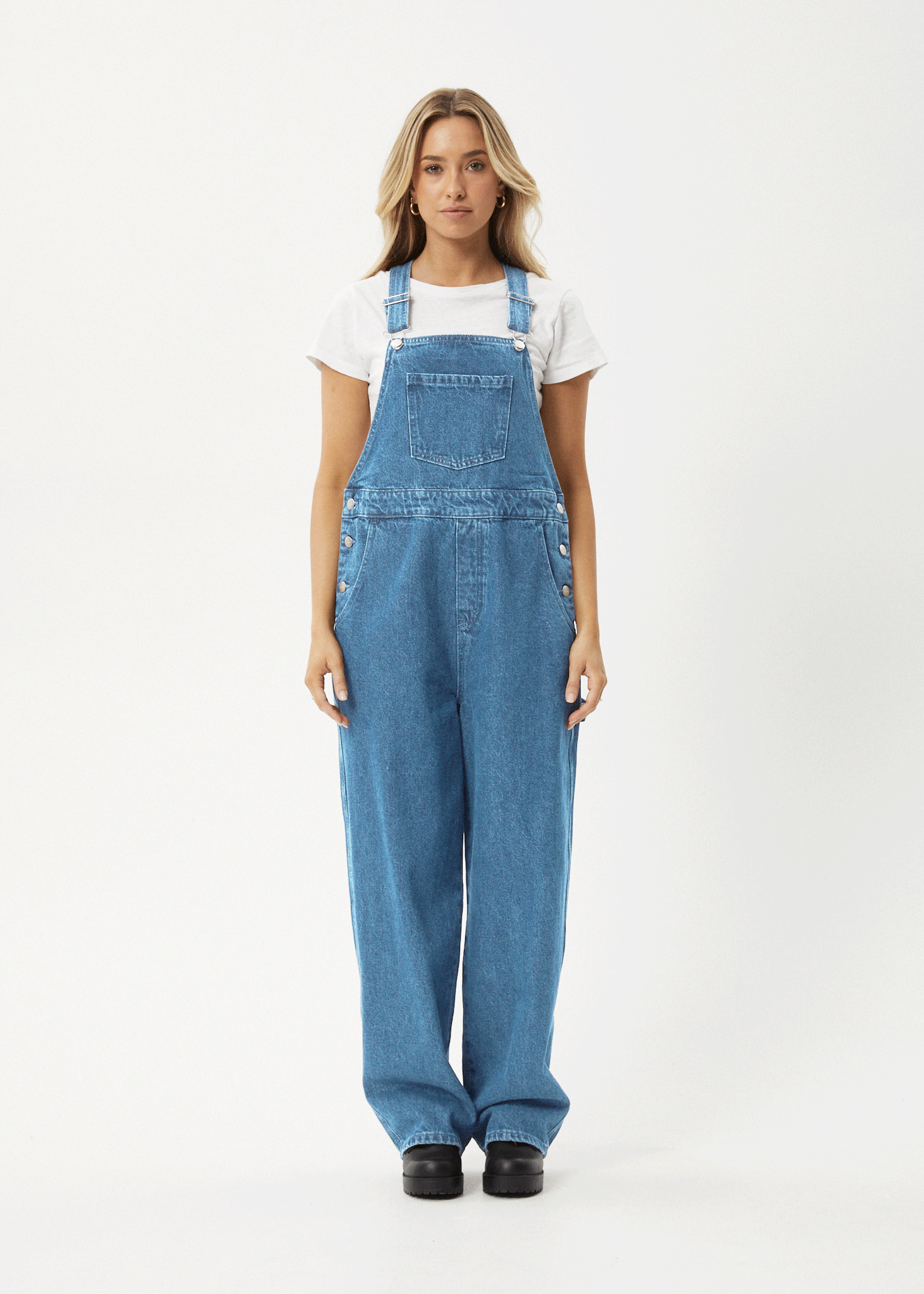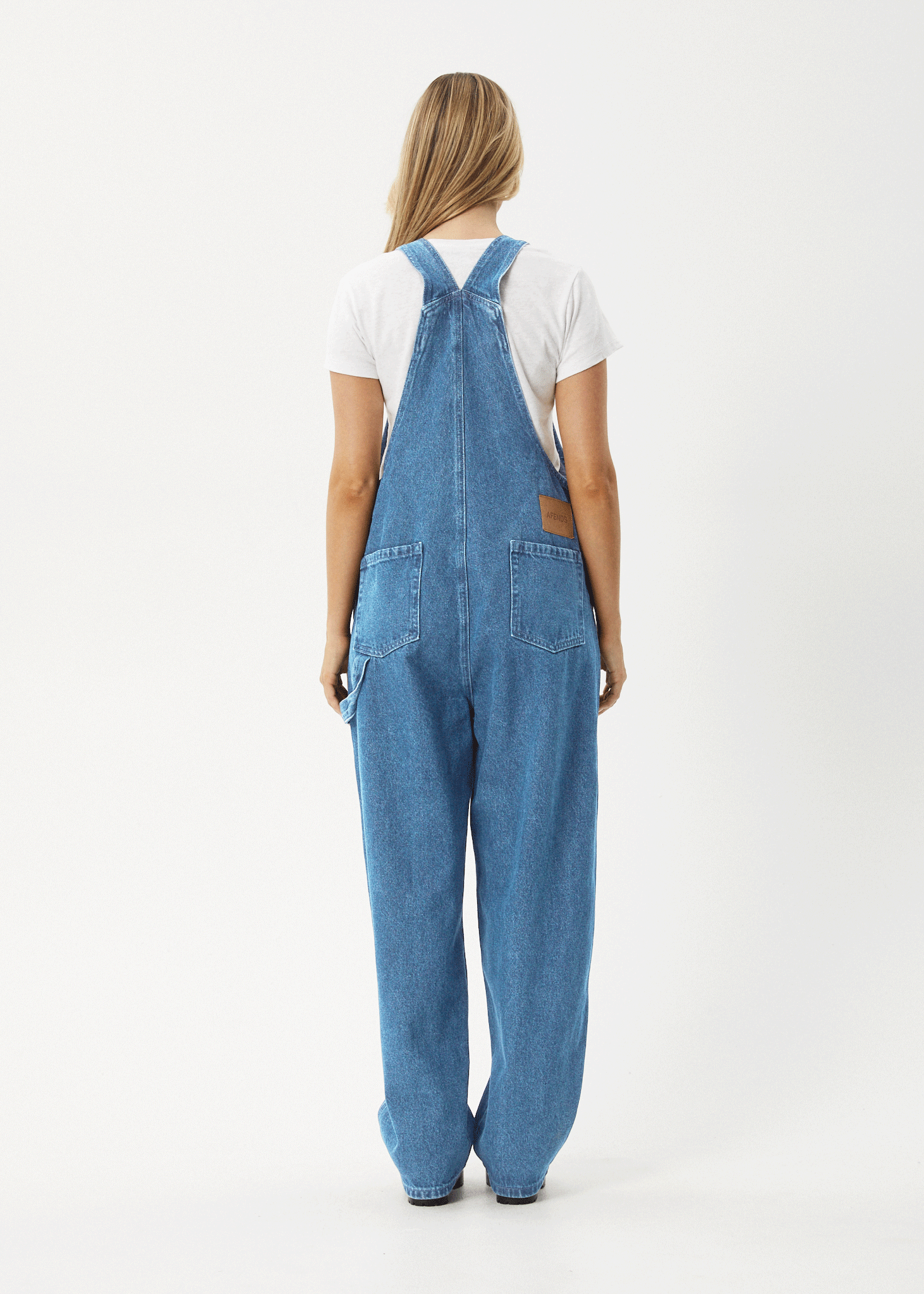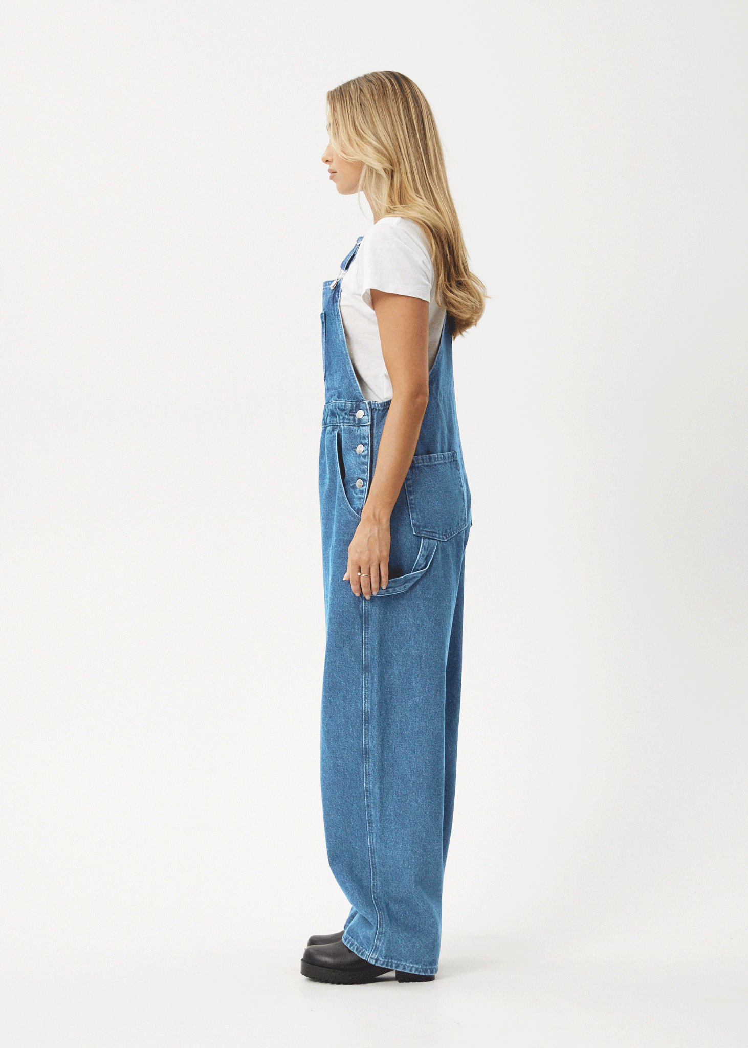 Womens Denim OverallsBaggy FitWide LegFront, Side and Back PocketsButton Clasp Adjustable StrapsButton Up SidesRecycled compressed card back patch