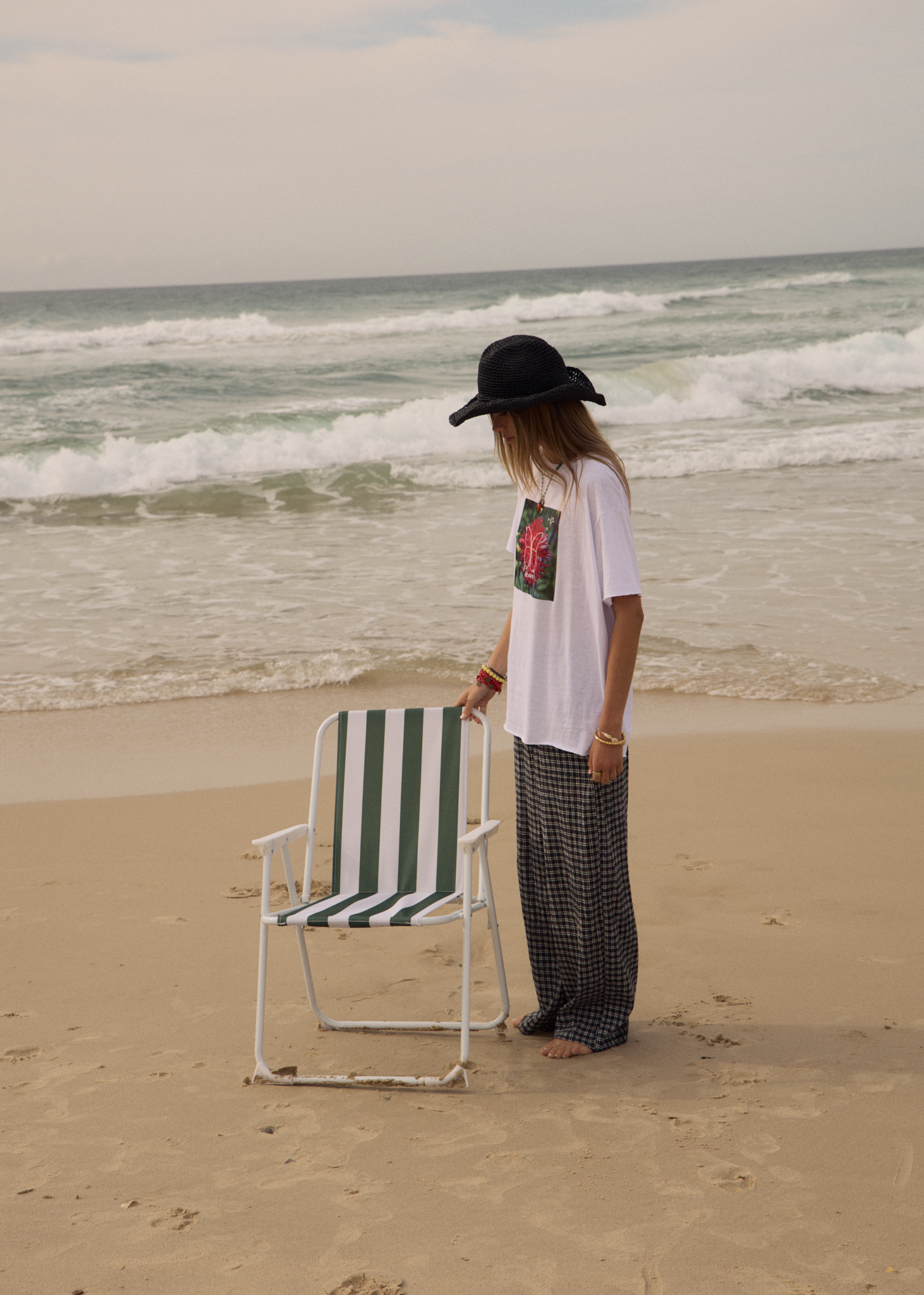 The 'Asta' wide leg pant combines hemp and tencel to create a textured stretch seersucker in a custom yarn dyed woven check, offering a lightweight feel with subtle structure. Designed with a baggy fit and mid-rise waist, it’s finished with an elasticated waistband with outer drawstring and slash opening patch pockets.