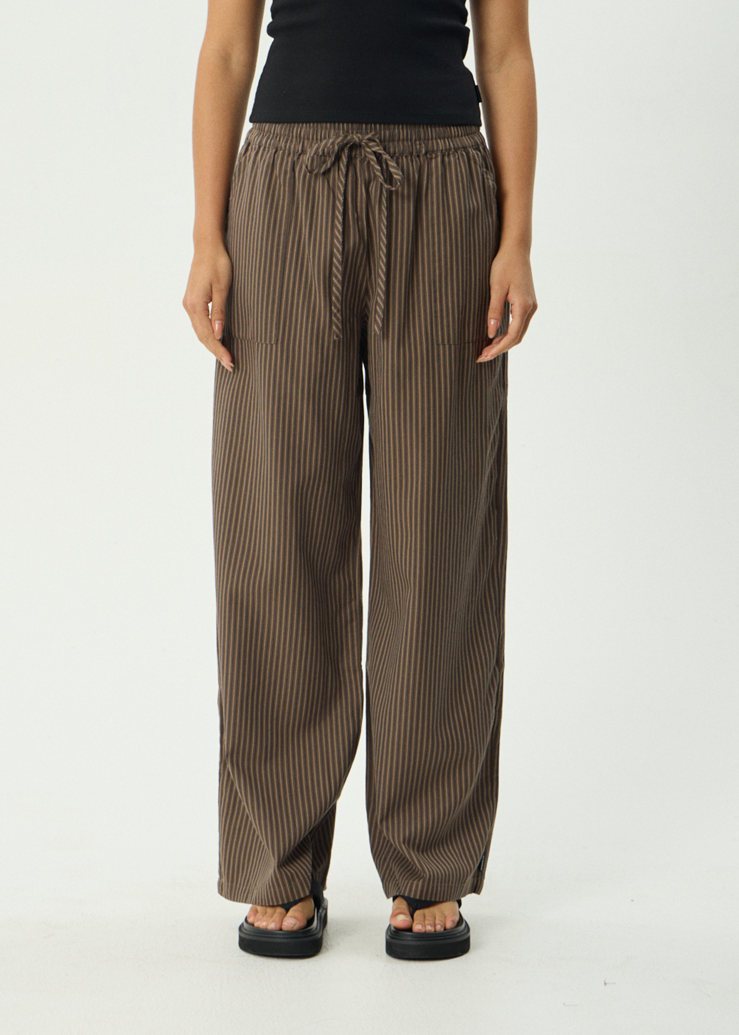 Womens wide leg pantMid rise waistElasticated waistband with outer drawcordSlash opening patch pocketsCustom yarn dyed woven stripesTrue to size