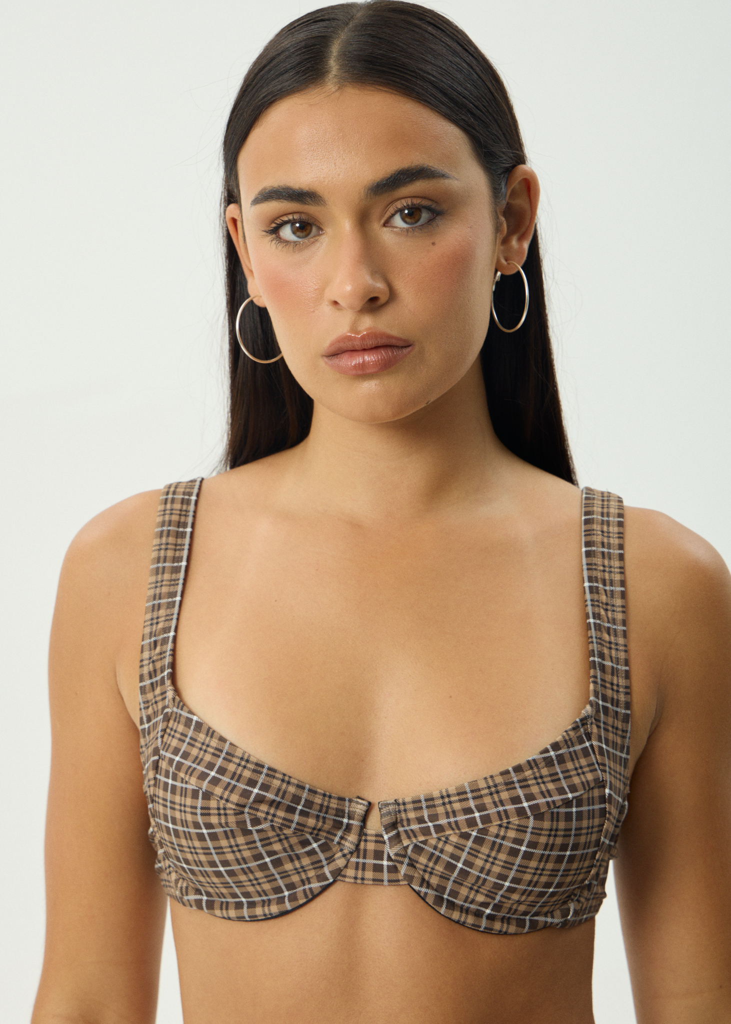 Hometown is back, reimagined in our swimwear range with updated cuts made for summer. This bikini top is designed with underwire cups for enhanced support and shaping, adjustable shoulder straps for a custom fit, and a silver rear clasp. Crafted from a recycled nylon blend, this piece is lightweight, quick drying, stretchy, and soft to the touch. Finished in our custom check print.