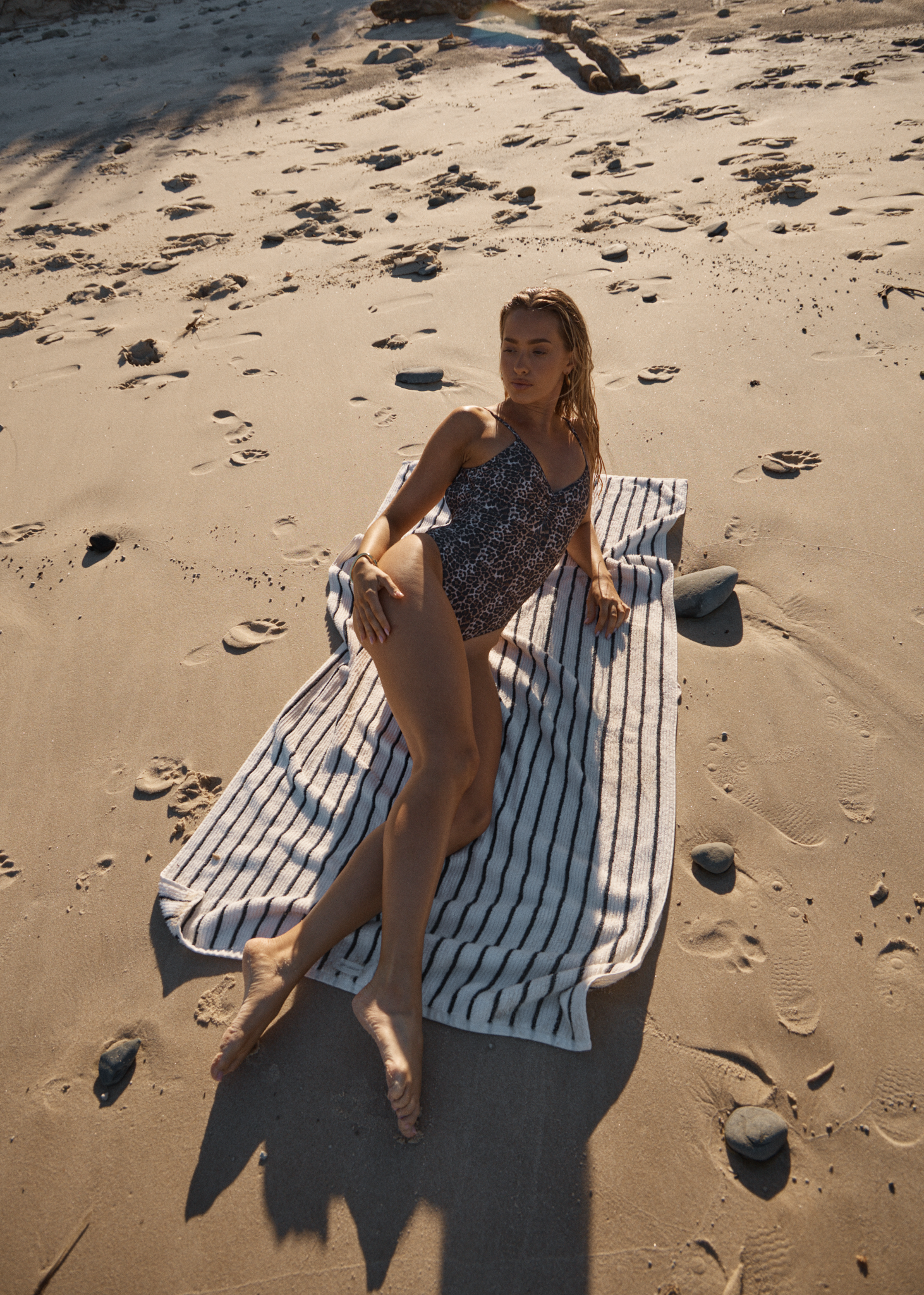 Leopard print, done our way. A fresh addition to our swimwear lineup, focused on trend-driven style and quality. Designed with a v-neckline, skimpy cut, centre front ruching and adjustable shoulder straps. Crafted from a recycled nylon blend, this piece is lightweight, quick drying, stretchy, and soft to the touch.