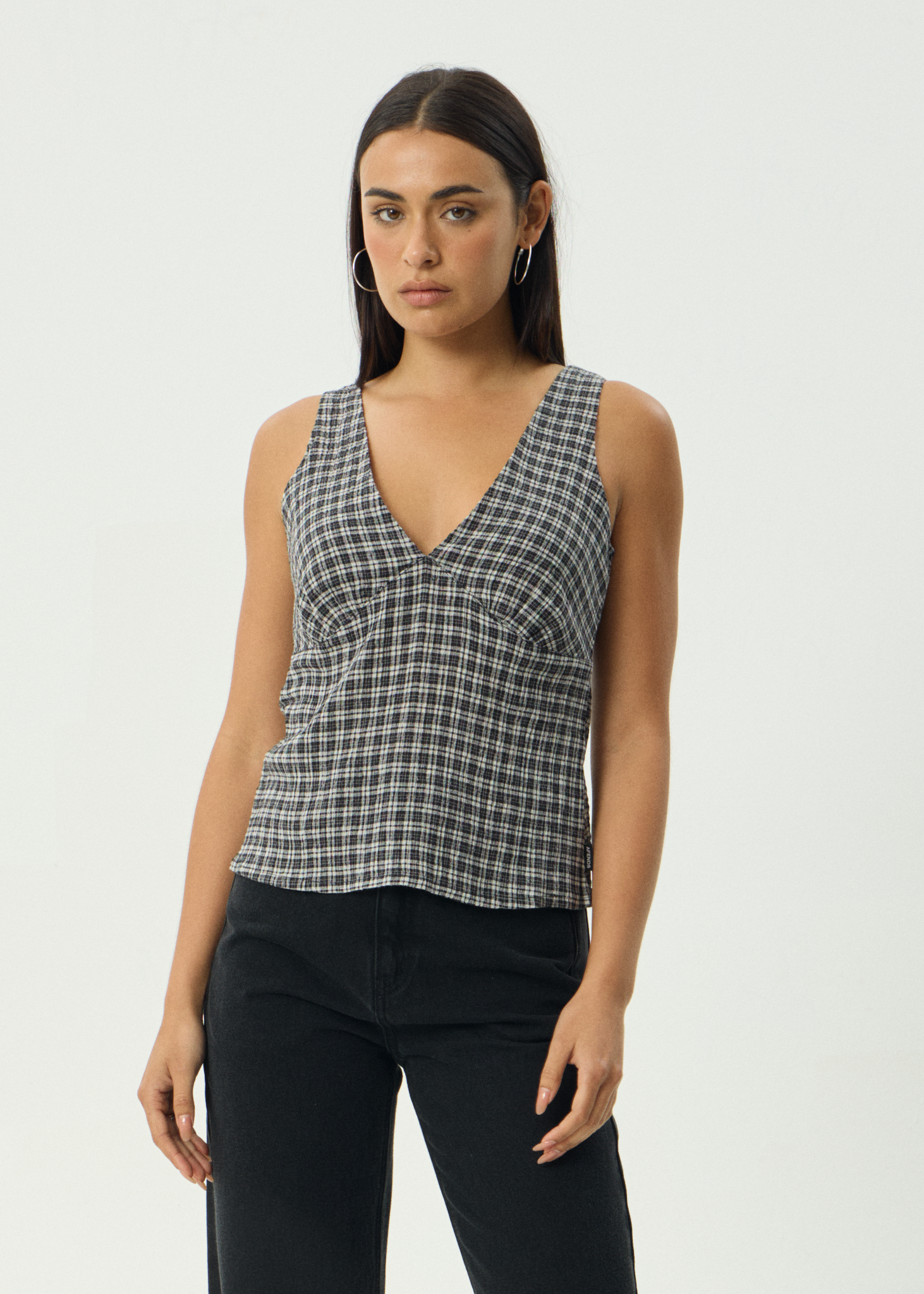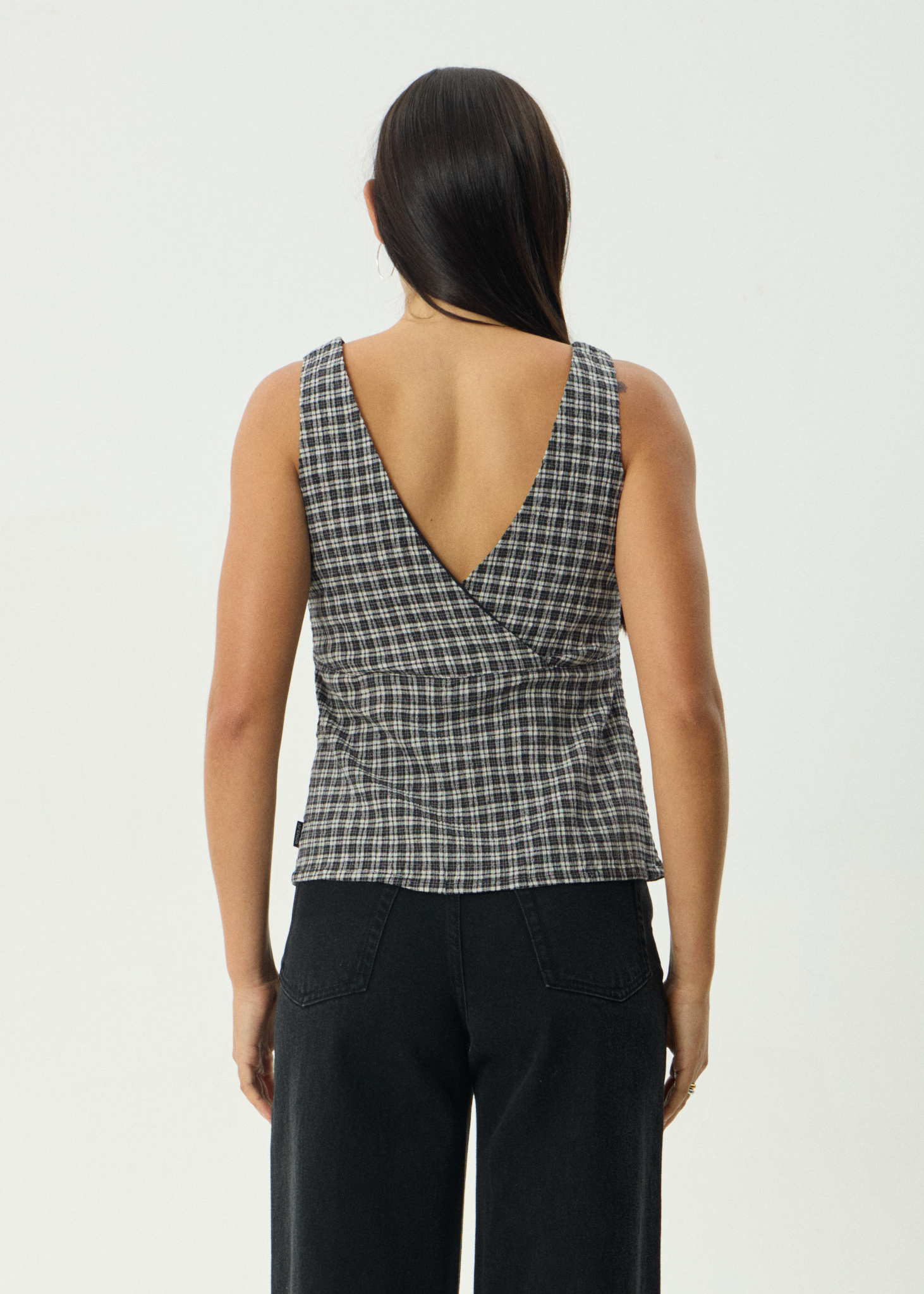 Womens seersucker topRelaxed fitV-neck and backGathered bustLined bodiceTextured stretch seersuckerCustom yarn dyed check