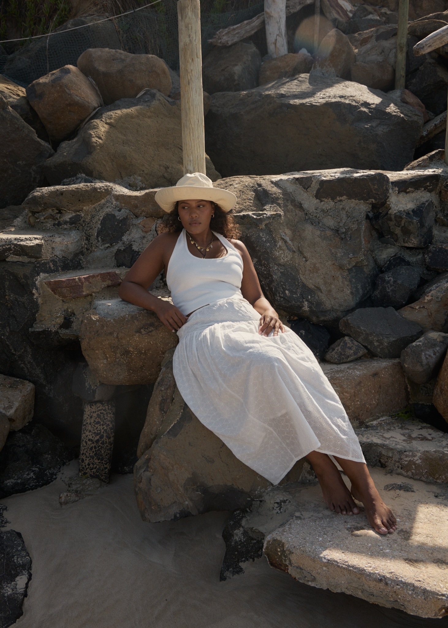 The 'Basis' halter top offers a sleek, tight fit with a scooped neckline and textured rib fabric. Crafted from a durable blend of organic and recycled cotton with a touch of spandex, its built to last while delivering a premium feel.