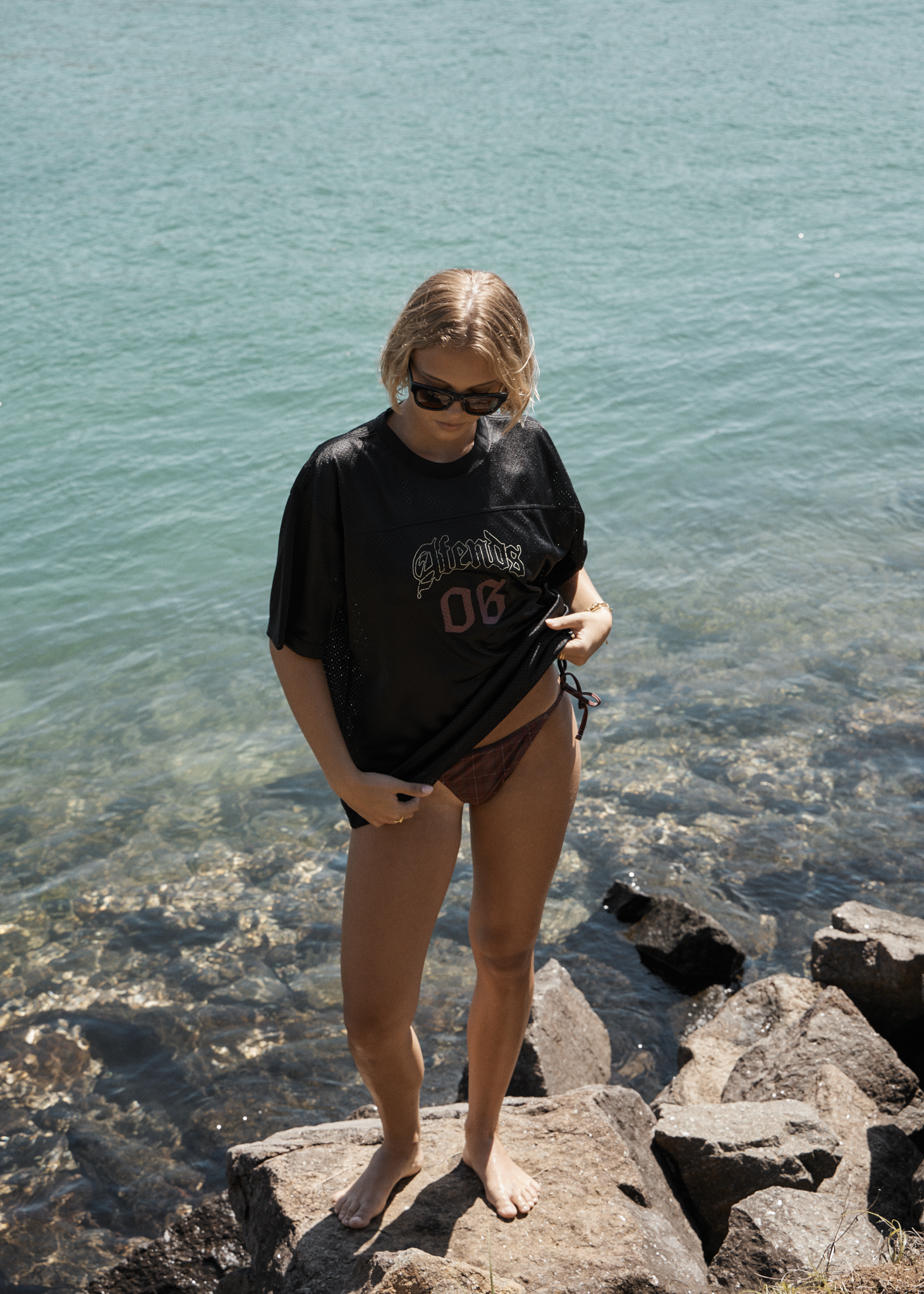 Our female lifestyle model wears a size S / 8 AU / 4 US and is 174cm tall with an 83cm bust, 65cm waist, and 95cm hips.