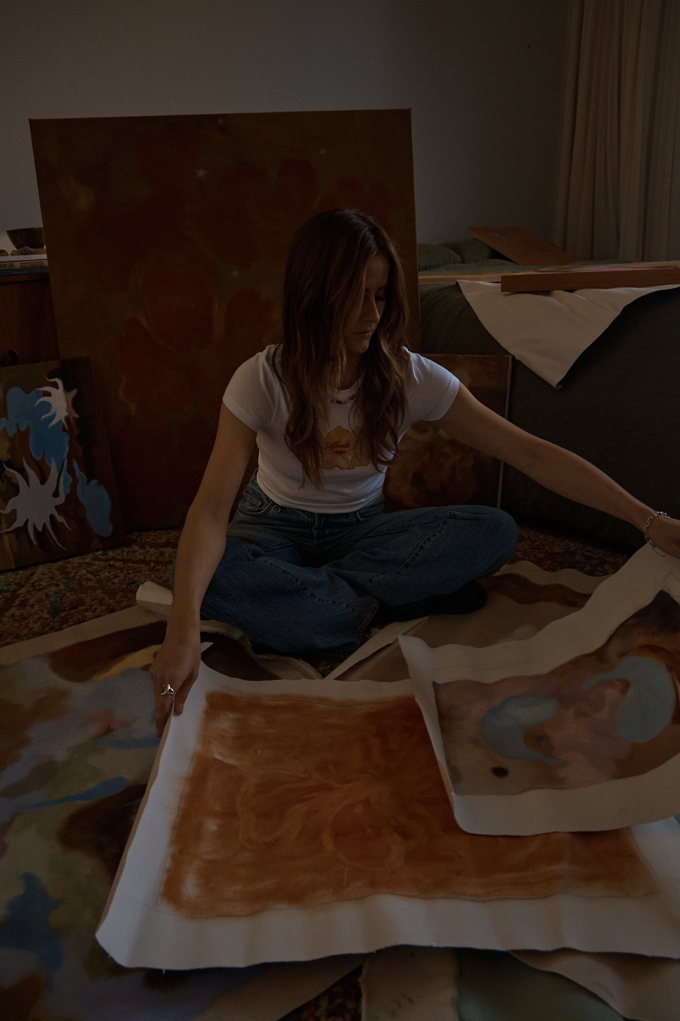This season features exclusive printed artwork by Australian artist Ella Thrupp, a Byron based artist known for her 'floating' technique, building up layers of acrylic and glaze to create rich, celestial florals that felt like a natural fit for the season. This baby tee is made from a recycled cotton blend jersey.