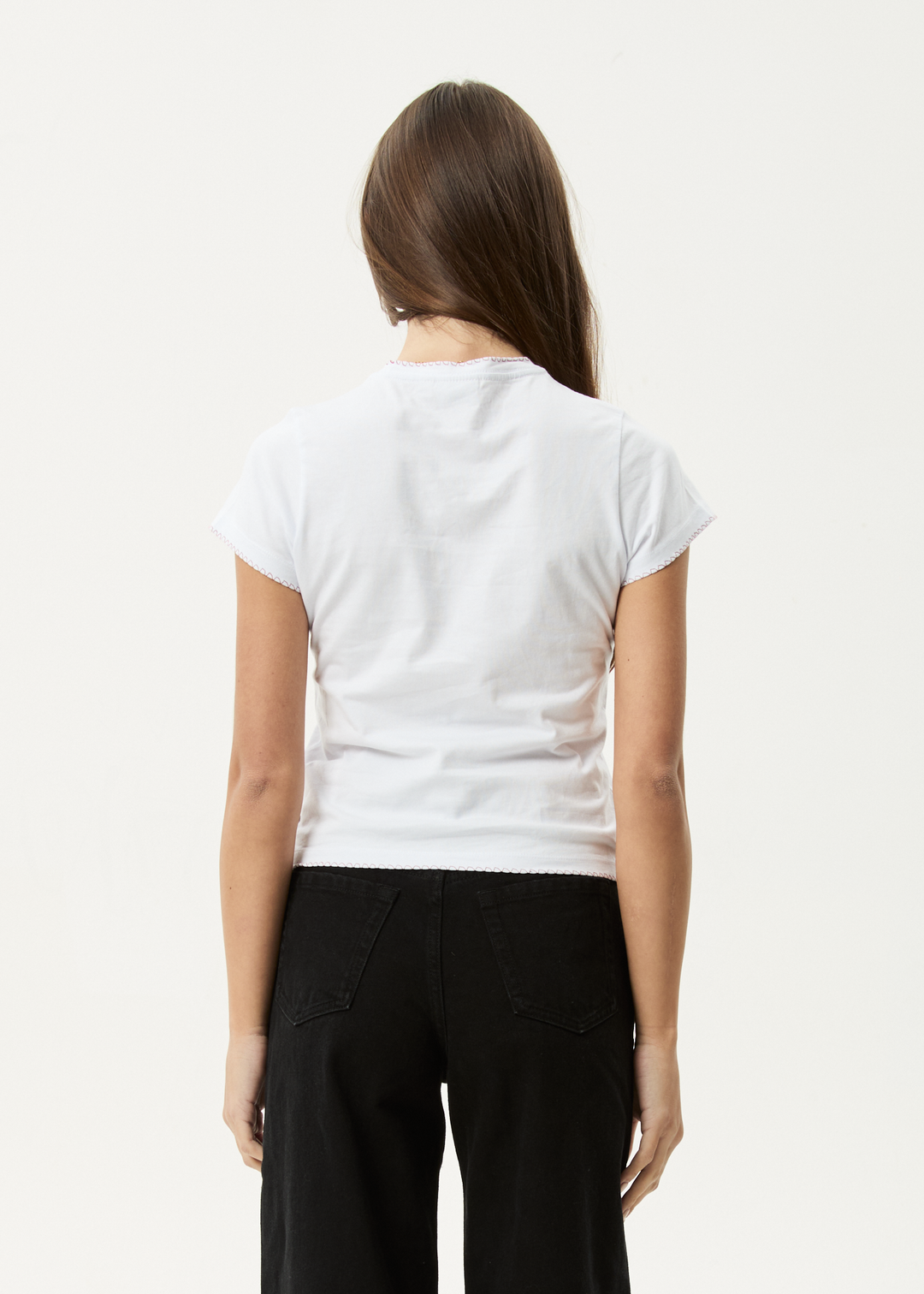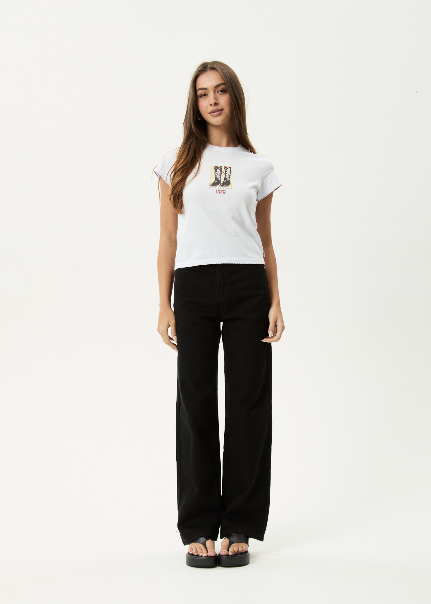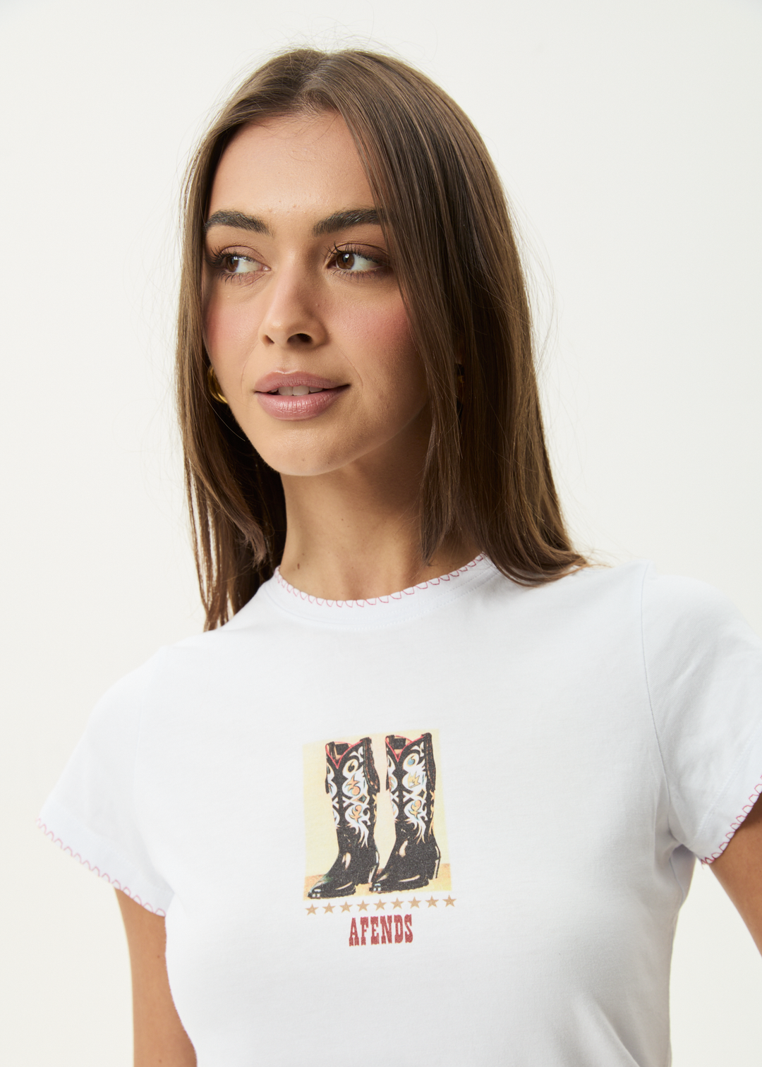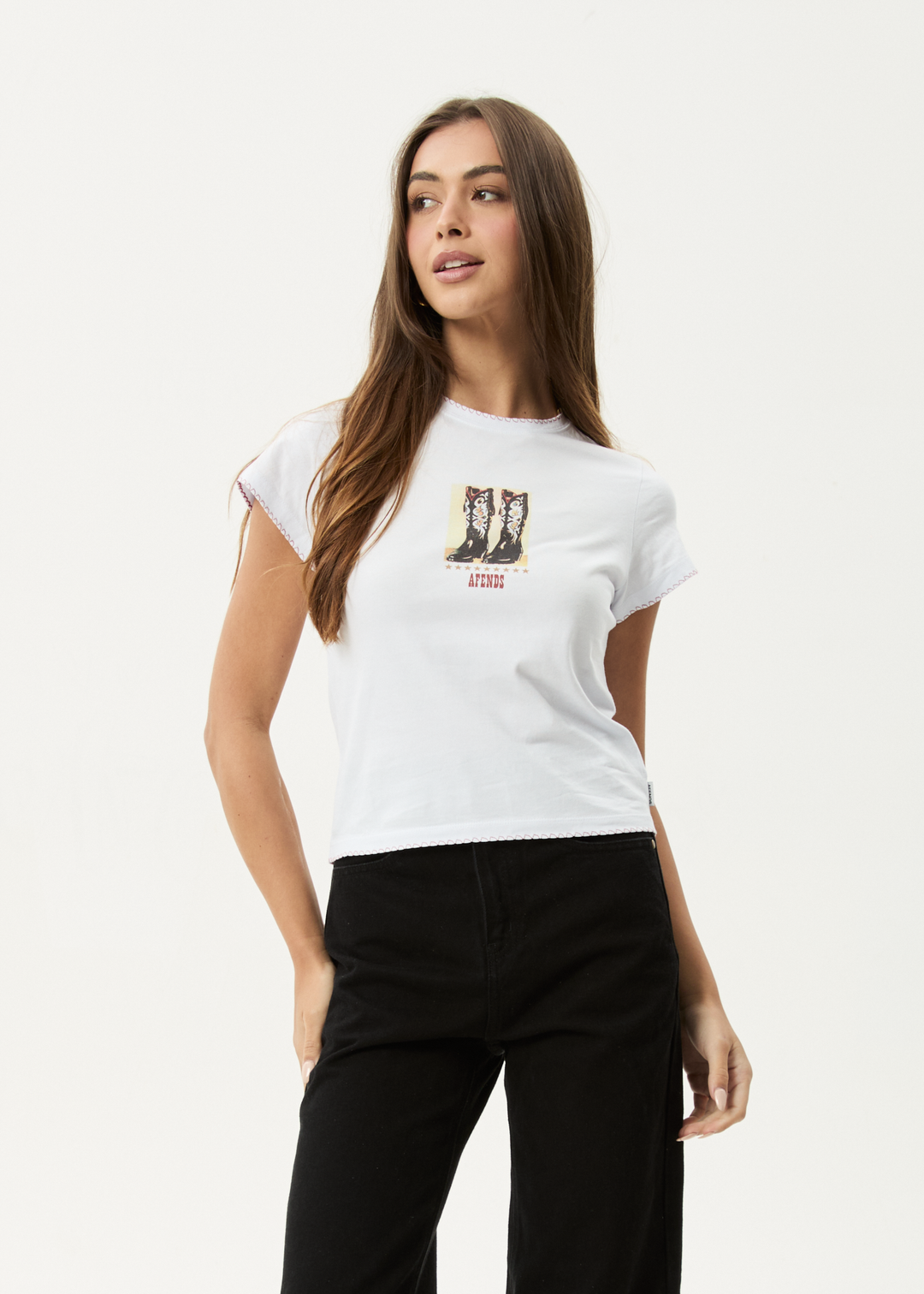 We're embracing an ongoing coastal cowgirl theme - a fusion of our laid-back AFENDS coastal streetwear roots with western cowgirl aesthetics. Designed with a cropped, slim fit and a ribbed crew neckline, this baby tee is made from a recycled cotton blend jersey. The contrast blanket stitch at the neck and hem adds subtle detail, while the screen printed artwork completes the look.