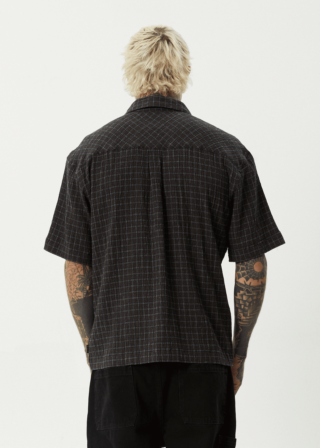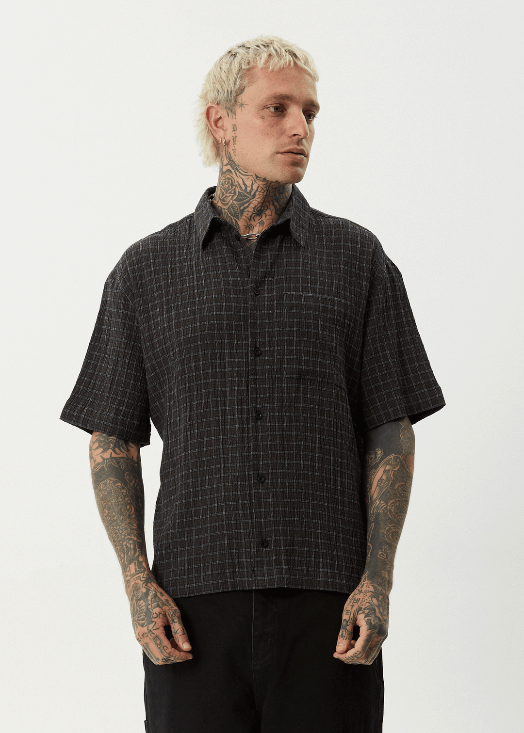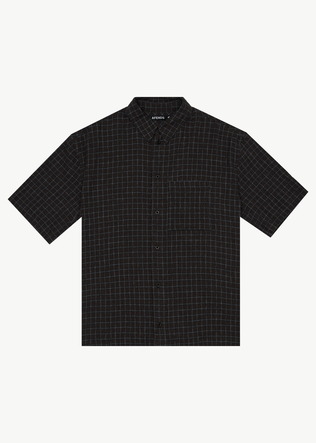 Unisex short sleeve shirtRelaxed fitCentre button upCustom yarn dyed woven checkTextured stretch seersuckerLightweight and breathable fabrication