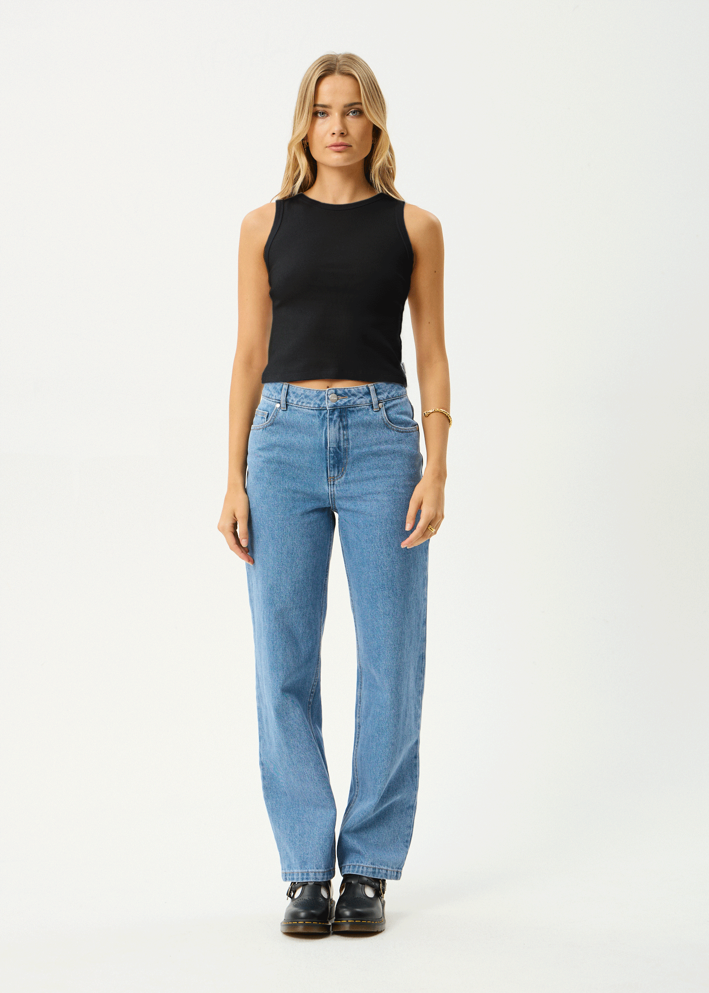 The 'Charlie' rib singlet offers a slim fit with a high neckline and square scooped back, crafted from a sustainable, heavyweight 290gsm blend of recycled cotton, organic cotton, and a touch of elastane, with a ribbed texture.