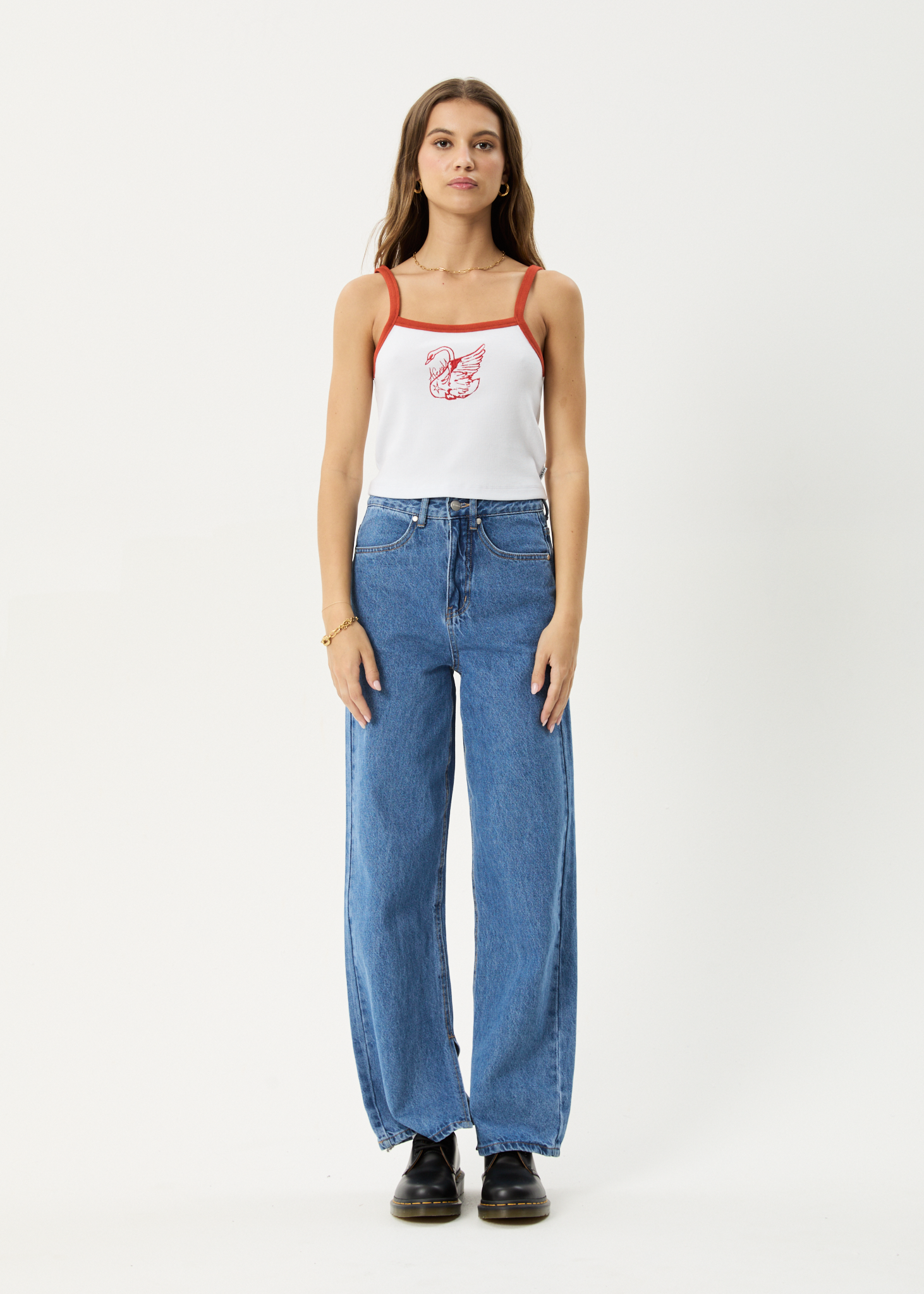 The 'Cygnet' singlet is made from a textured rib fabric with a square neckline, spaghetti straps, and contrast neck binding. Finished with an embroidered graphic at the chest.