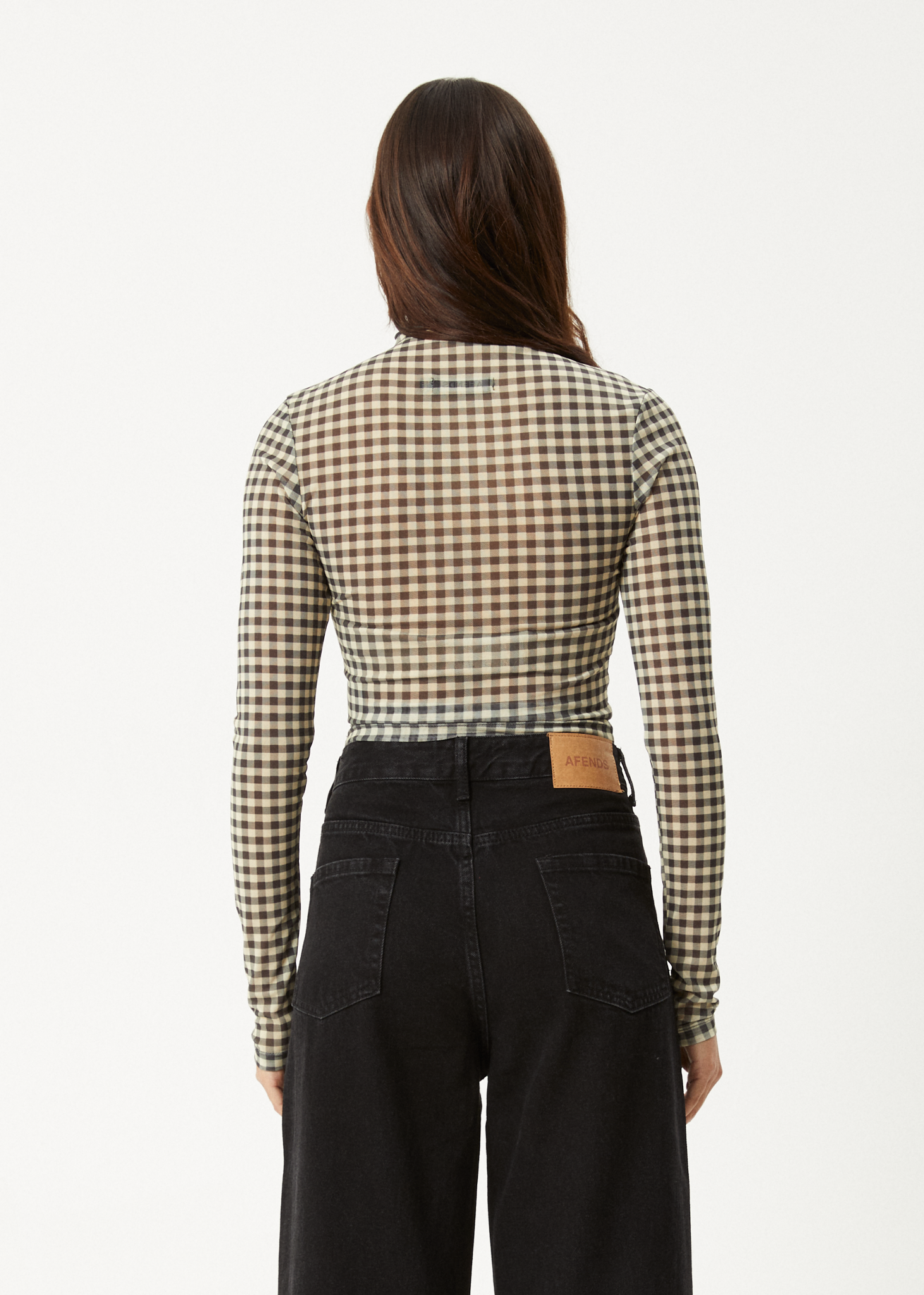 The 'Gambet' collection is designed in a black and sand palette and made from recycled sheer stretch mesh fabric. This long sleeve top offers a tight fit, high neck with a slightly cropped length.
